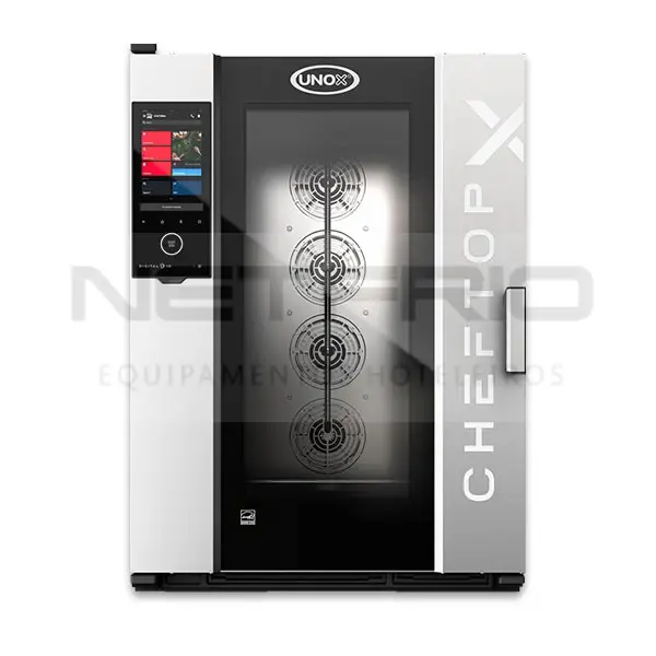 Forno combinado profissional de alto desempenho, equipado com um sistema operacional de última geração e tecnologia inteligente, projetado para gerenciar perfeitamente qualquer processo de cozimento de gastronomia, pastelaria e panificação. Possui certificação ENERGY STAR® para desempenho de baixo consumo e redução de resíduos, também graças ao seu sistema de lavagem automática com recirculação. O CHEFTOP-X™ possui uma câmara de cozimento moldada em aço 316L e um sistema integrado de filtragem de água RO.Care que elimina a necessidade de tratamentos externos. É equipado com um microfone integrado para permitir o controle de voz e a interação com os Chefs Corporativos da UNOX para receber assistência na cozinha diretamente pelo painel interativo. O sistema operacional avançado Digital.ID™ permite salvar todas as configurações favoritas na conta e transferi-las de um forno para outro em poucos segundos. Com o aplicativo Digital.ID™, é possível controlar o forno por meio de smartphones, bem como personalizar contas.