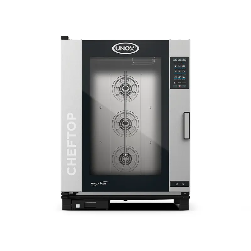 Forno combinado profissional inteligente capaz de gerenciar diversos processos de cocção (desidratação, cocção ao vapor, cocção em baixa temperatura, cocção sous vide; grelhar, dourar, fritar, regeneração e regeneração no prato) e processos de cocção de pães e confeitarias (fresca e congelada) graças as tecnologias Unox Intensive Cooking e Intelligent Performance, que garantem resultados perfeitos e sempre iguais. Gestão automática dos processos de cocção (CHEFUNOX) para cocções sempre perfeitas também na ausência de pessoal qualificado.