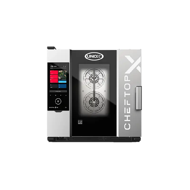 Forno combinado profissional de alto desempenho, equipado com um sistema operacional de última geração e tecnologia inteligente, projetado para gerenciar perfeitamente qualquer processo de cozimento de gastronomia, pastelaria e panificação. Possui certificação ENERGY STAR® para desempenho de baixo consumo e redução de resíduos, também graças ao seu sistema de lavagem automática com recirculação. O CHEFTOP-X™ possui uma câmara de cozimento moldada em aço 316L e um sistema integrado de filtragem de água RO.Care que elimina a necessidade de tratamentos externos. É equipado com um microfone integrado para permitir o controle de voz e a interação com os Chefs Corporativos da UNOX para receber assistência na cozinha diretamente pelo painel interativo. O sistema operacional avançado Digital.ID™ permite salvar todas as configurações favoritas na conta e transferi-las de um forno para outro em poucos segundos. Com o aplicativo Digital.ID™, é possível controlar o forno por meio de smartphones, bem como personalizar contas.