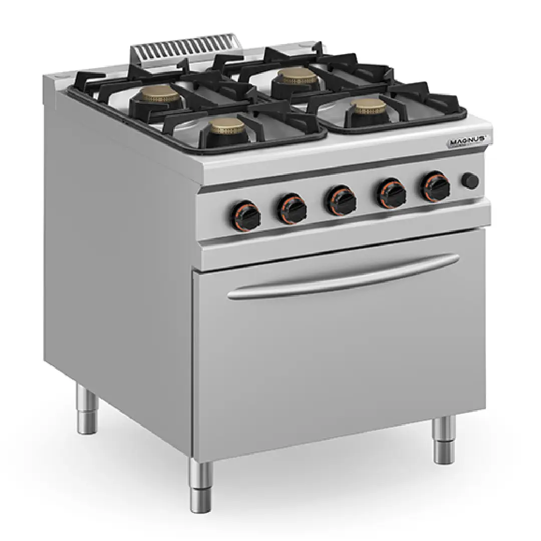 Forno a gás GN2/1: Potência de 7 kW com excelente isolamento térmico, queimadores em aço inox com chama auto-estabilizadora e isqueiro, câmara em aço inox com base esmaltada e porta com dupla parede em aço inox. Dotado de 3 guias em aço inox.