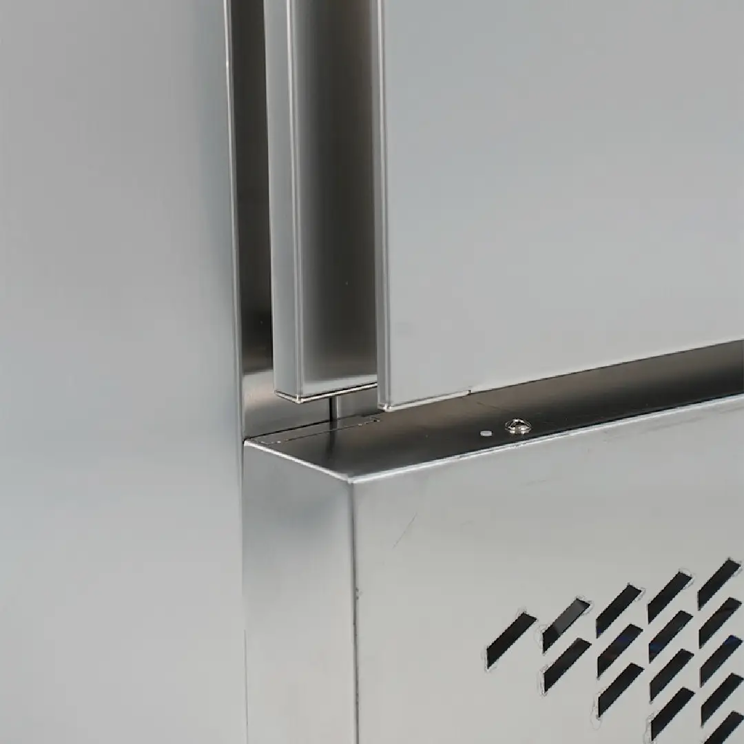 Exterior totalmente em aço inoxidável com acabamento acetinado. Interior em aço inoxidável.