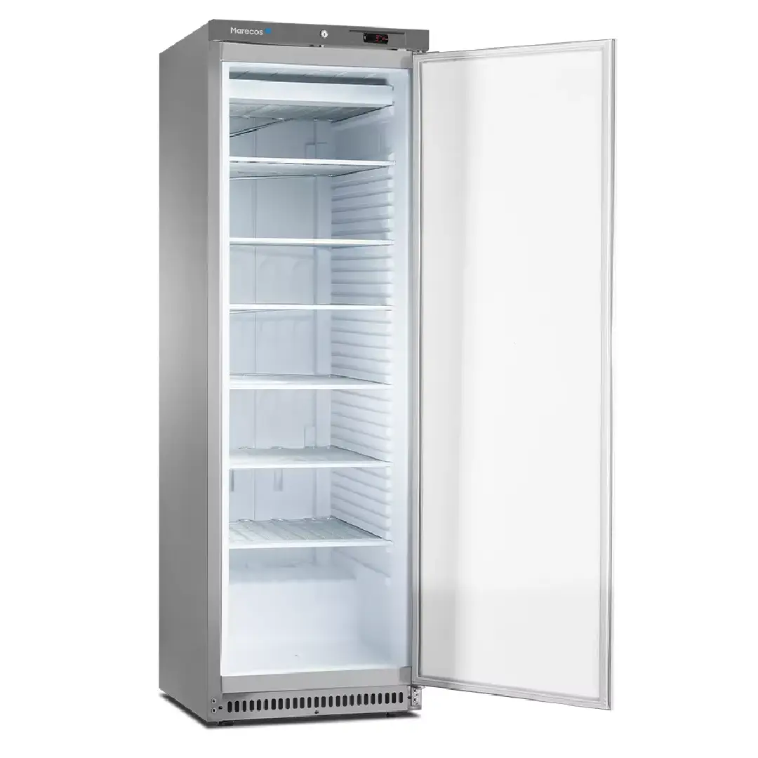 Dotado de fechadura de serie, exterior em aço inox, interior em plástico termoformado, 6 prateleiras fixas, porta reversível com fecho automático e 4 deslizadores com 2 pés niveladores.