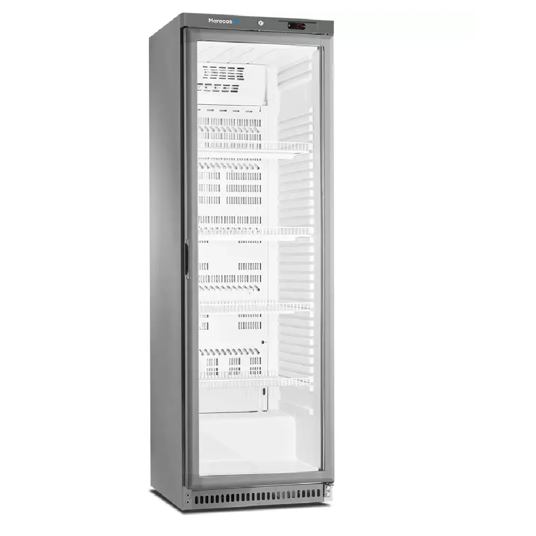 Dotado de fechadura de serie, exterior em aço inox, interior em plástico termoformado, 4 prateleiras amovíveis em aço plastificado, porta em vidro duplo reversível com fecho automático, iluminação vertical led para melhor visualização dos produtos no interior e 4 deslizadores com 2 pés niveladores.