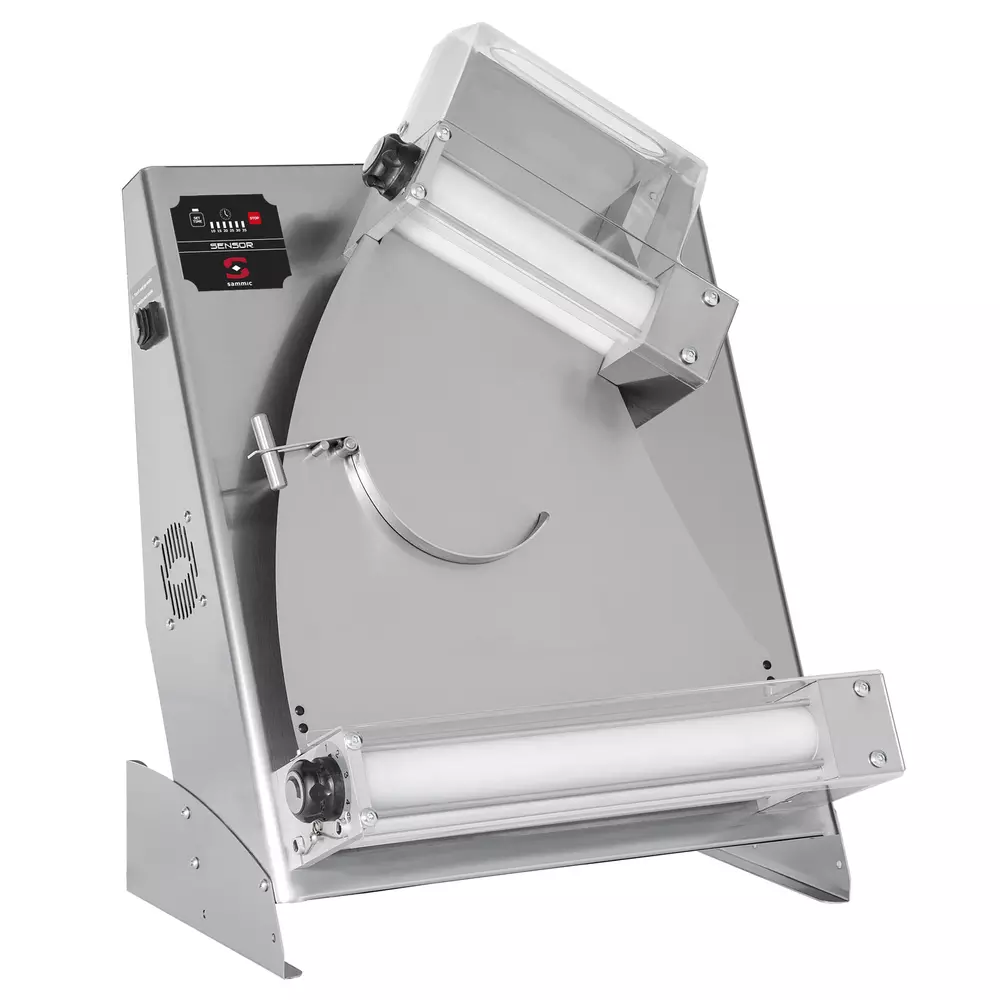 Com estrutura fabricada totalmente em aço inoxidável, a posição dos rolos está indicada para obter bases de massa redondas